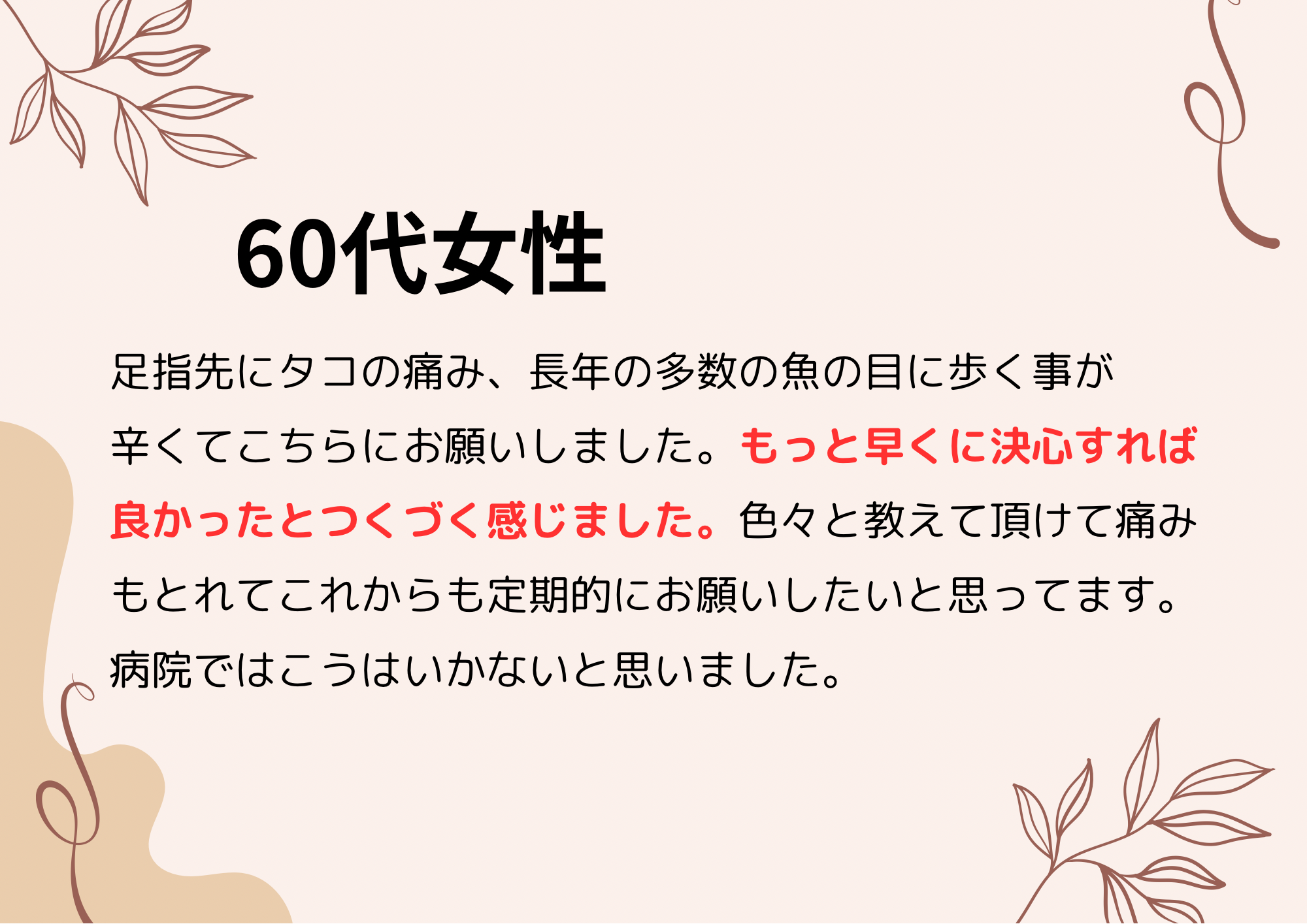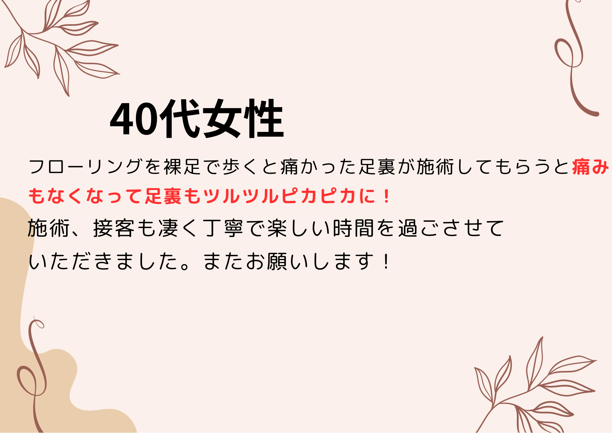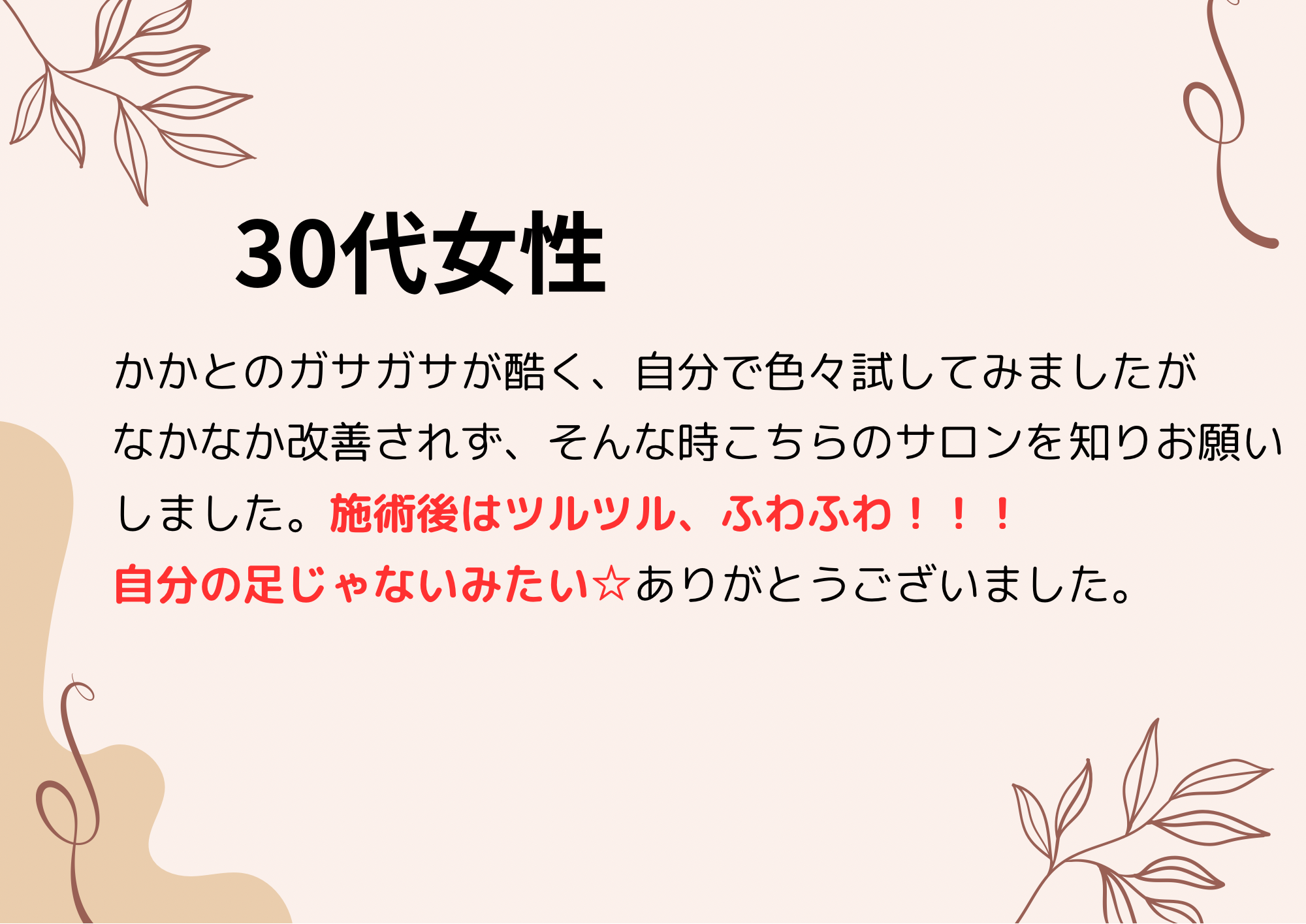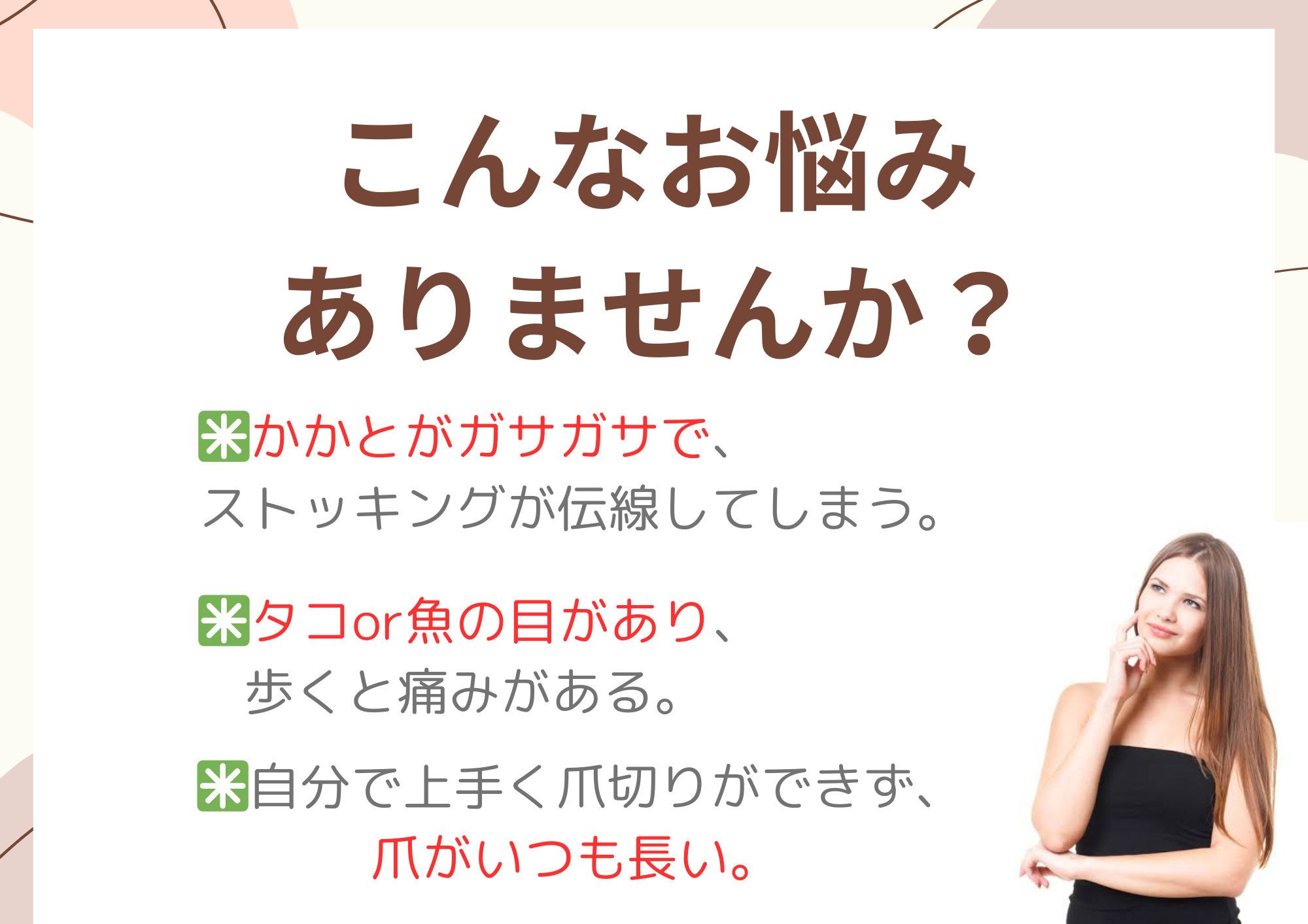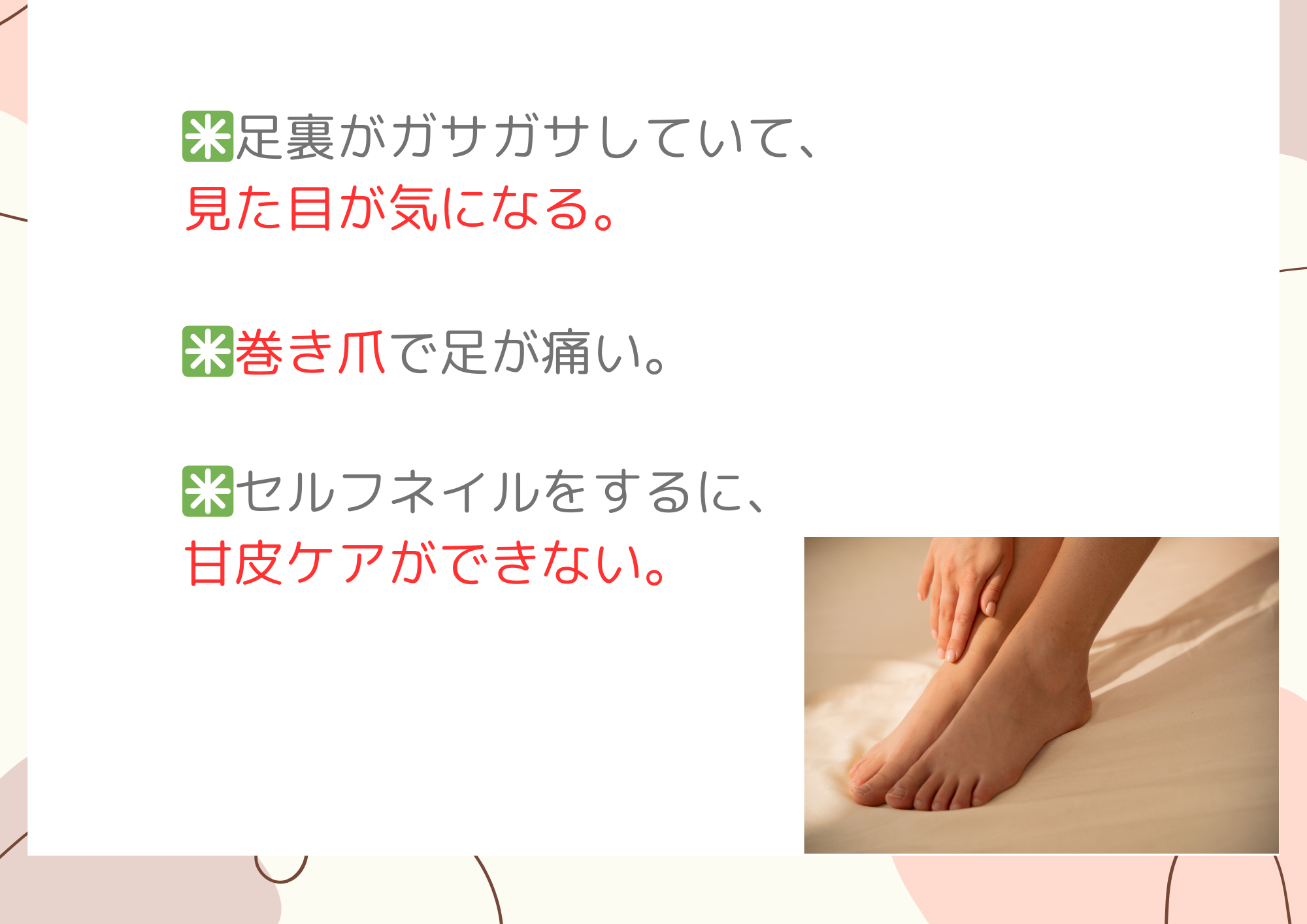 自分でケアしたけど改善しない<魚の目><硬くて気になるタコ> やく皮が剥がれる鱗状の角質> にお悩みの方へ◎痛みだけではなく見た目も綺麗になる施術で人気☆